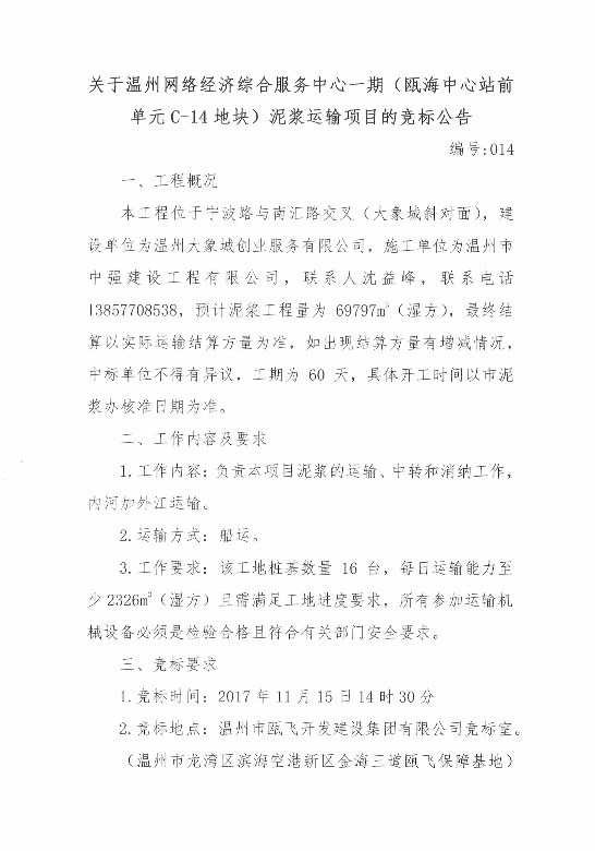 ¹ØÓÚÎÂÖÝÍøÂç¾­¼Ã×ۺϷþÎñÖÐÐÄÒ»ÆÚ£¨ê±º£ÖÐÐÄվǰµ¥Î»C-14µØ¿é£©ÄཬÔËÊäÏîÄ¿µÄ¾º±êͨ¸æ