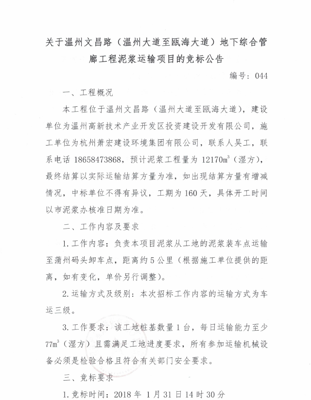 ¹ØÓÚÎÂÖÝÎIJý·£¨ÎÂÖÝ´óµÀÖÁ걺£´óµÀ£©µØÏÂ×ۺϹÜÀȹ¤³ÌÄཬÔËÊäÏîÄ¿µÄ¾º±êͨ¸æ