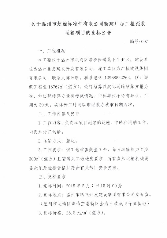 ¹ØÓÚÎÂÖÝÊг¬ÐÛ±ê×¼¼þÓÐÏÞ¹«Ë¾Ð½¨³§·¿¹¤³ÌÄཬÔËÊäÏîÄ¿µÄ¾º±êͨ¸æ