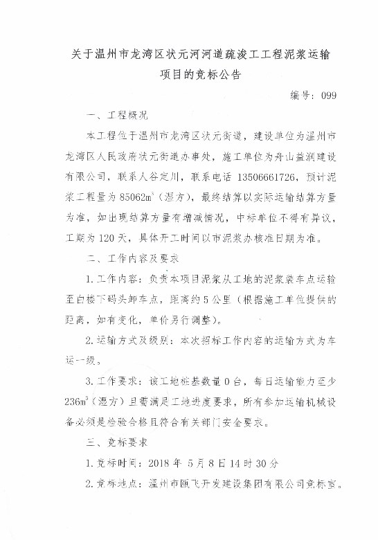 ¹ØÓÚÎÂÖÝÊÐÁúÍåÇø×´ÔªºÓºÓÁ÷Êè¿£¹¤¹¤³ÌÄཬÔËÊäÏîÄ¿µÄ¾º±êͨ¸æ
