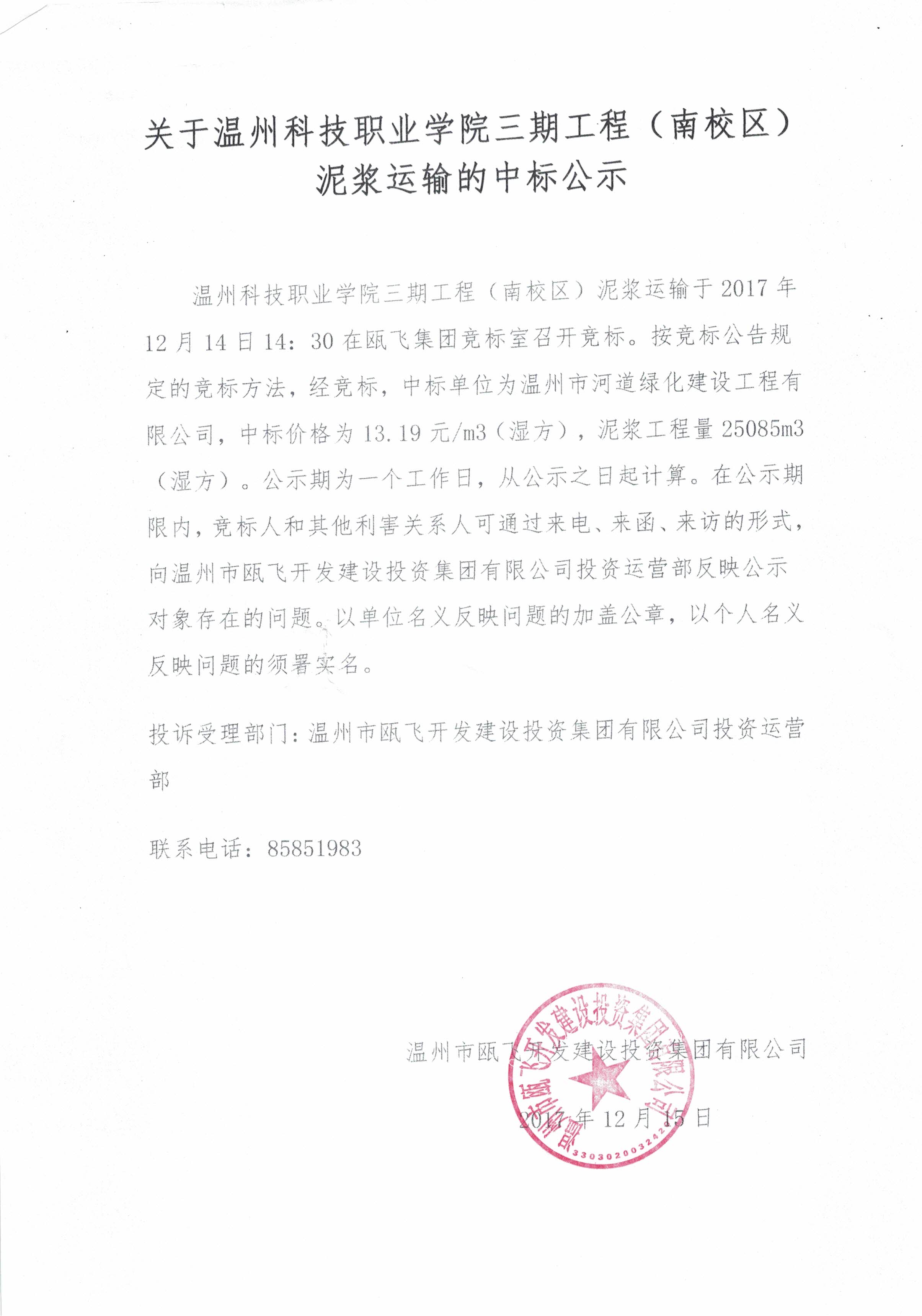 ÎÂÖݿƼ¼Ö°ÒµÑ§ÔºÈýÆÚ¹¤³Ì£¨ÄÏÐ£Çø£©ÄཬÔËÊäÓÚ2017Äê12ÔÂ14ÈÕ14£º30ÔÚ¶¶È¦¼¯Ížº±êÊÒÕÙ¿ª¾º±ê¡£°´¾º±êͨ¸æ»®¶¨µÄ¾º±êÒªÁ죬¾¾º±ê£¬Öб굥λΪÎÂÖÝÊкÓÁ÷ÂÌ»¯½¨É蹤³ÌÓÐÏÞ¹«Ë¾£¬Öбê¼ÛǮΪ13.19Ôª/m3£¨Êª·½£©£¬Äཬ¹¤³ÌÁ¿25085m3£¨Êª·½£©¡£¹«Ê¾ÆÚΪһ¸öÊÂÇéÈÕ£¬´Ó¹«Ê¾Ö®ÈÕÆðÅÌËã¡£ÔÚ¹«Ê¾ÏÞÆÚÄÚ£¬¾º±êÈËºÍÆäËûÀûº¦¹ØÏµÈË¿Éͨ¹ýÀ´µç¡¢À´º¯¡¢À´·ÃµÄÐÎʽ£¬Ïò¶¶È¦Í¶×ÊÔËÓª²¿·´Ó¦¹«Ê¾¹¤¾ß±£´æµÄÎÊÌâ¡£ÒÔµ¥Î»ÃûÒå·´Ó¦ÎÊÌâµÄ¼Ó¸Ç¹«Õ£¬ÒÔСÎÒ˽¼ÒÃûÒå·´Ó¦ÎÊÌâµÄÐëÊðʵÃû¡£